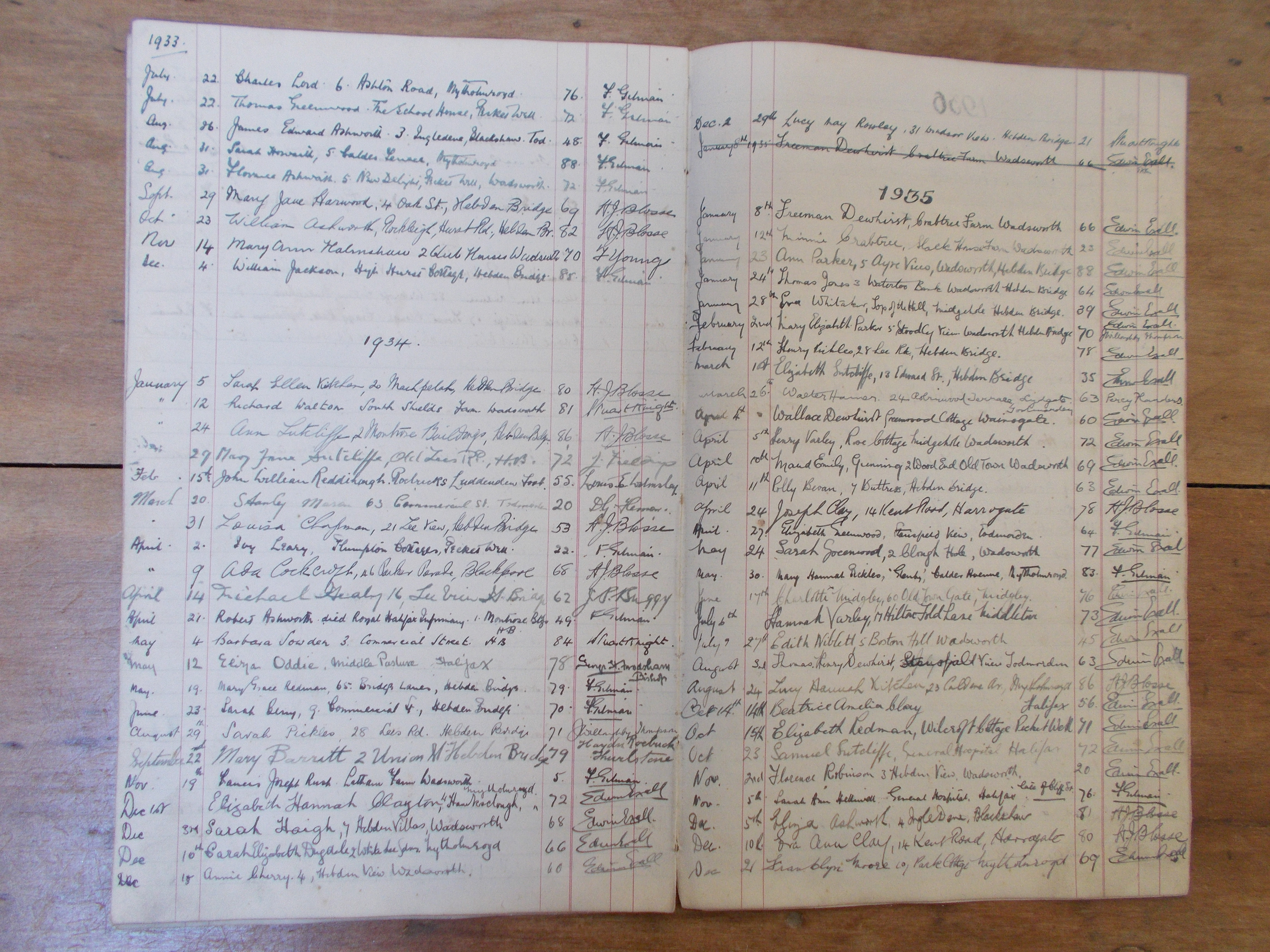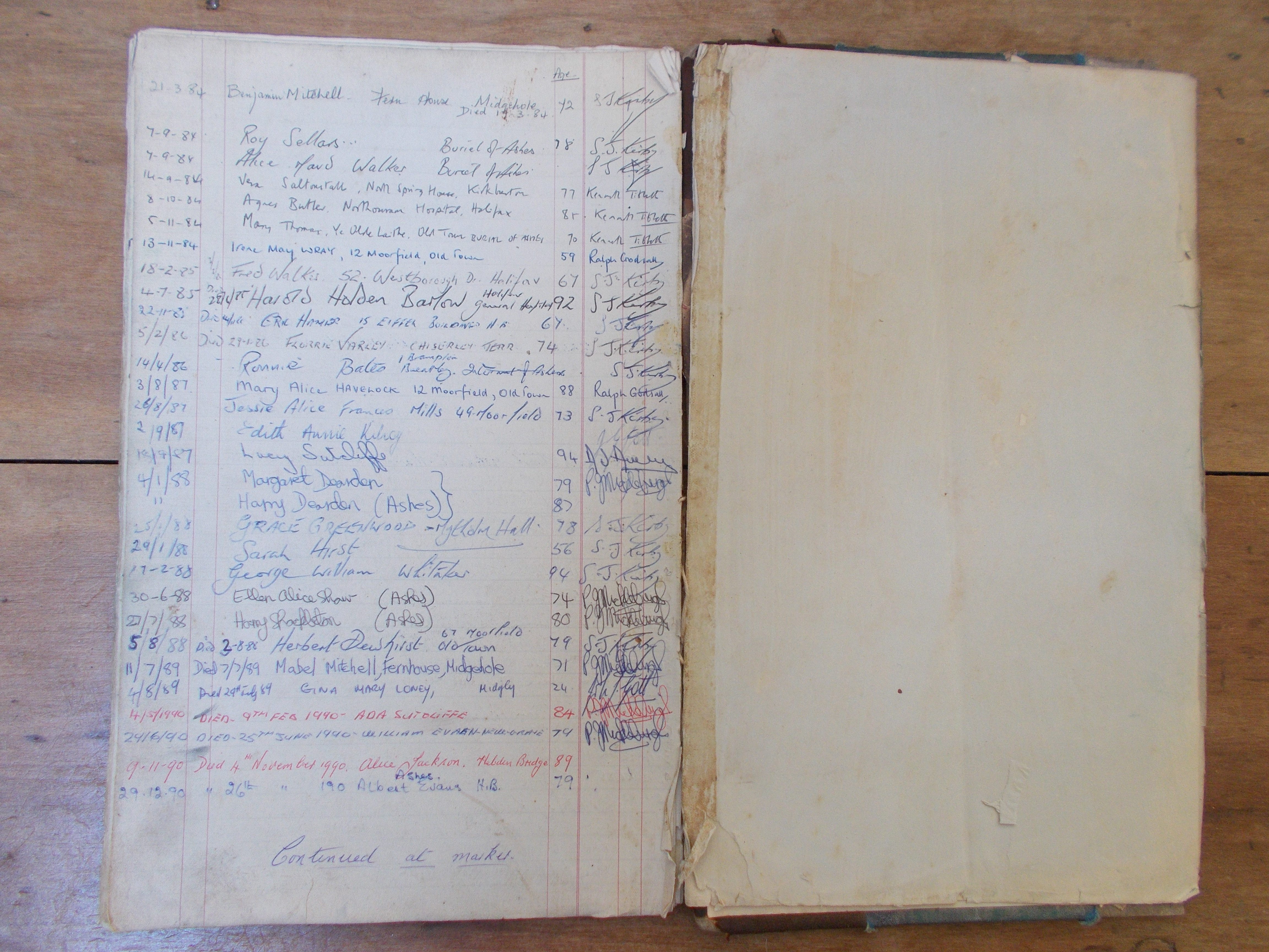 The main record of burials from 1815 until 2004 (when Wainsgate was transferred to the Historic Chapels Trust) is a large register, now rather dilapidated (R / WAI 52M) which is kept in the Hebden Bridge Local History Society archive at Birchcliffe. It lists most of the burials from 17th February 1815 (Hannah Bancroft, aged 79) to 25th October 2004 (Kenneth Crowther, aged 78): a few burials do not seem to have been recorded, and there are no entries for 1900 or 1901. The earlier entries, up to 1878 when George Wilkinson became minister, seem to have been copied into the register from other documents, whereas the later entries appear to have been made at the time of burial.