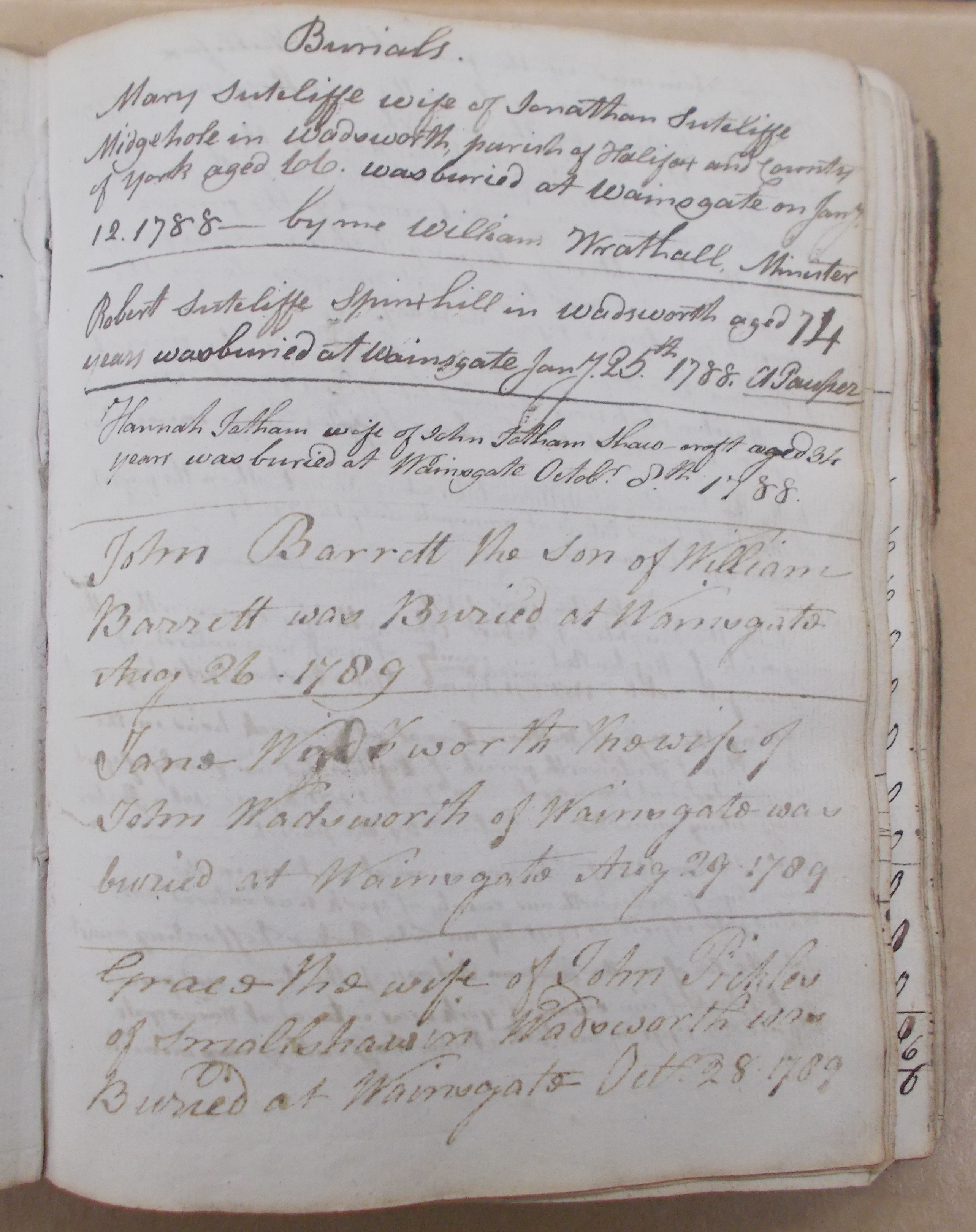 Mary Sutcliffe wife of Jonathan Sutcliffe, Midgehole in Wadsworth, parish of Halifax and county of York aged 66. was buried at Wainsgate on January 12. 1788 – by me William Wrathall, Minister