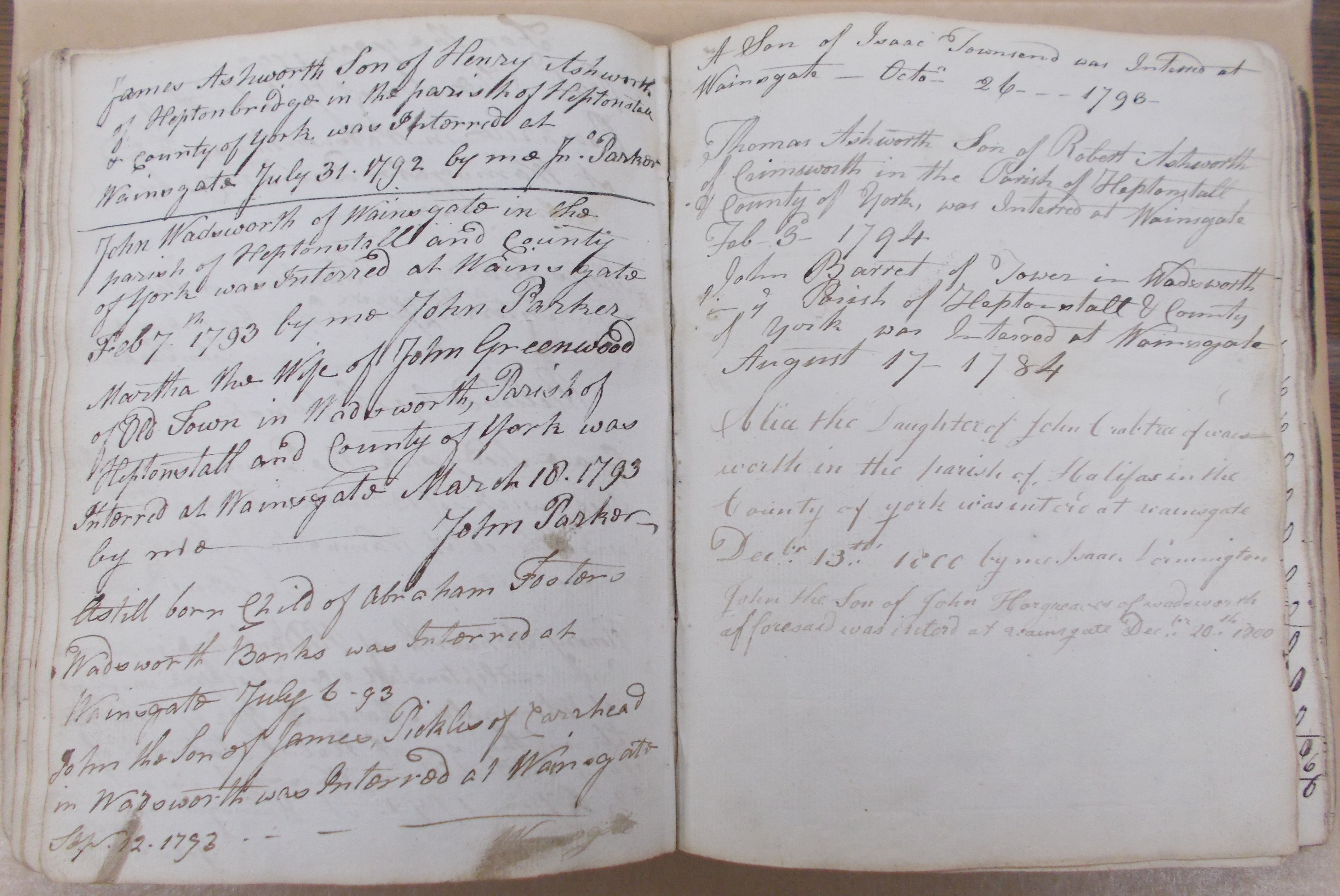 James Ashworth Son of Henry Ashworth of Heptonbridge in the parish of Heptonstall & county of york was Interred at Wainsgate July 31. 1792 by me Jno Parker