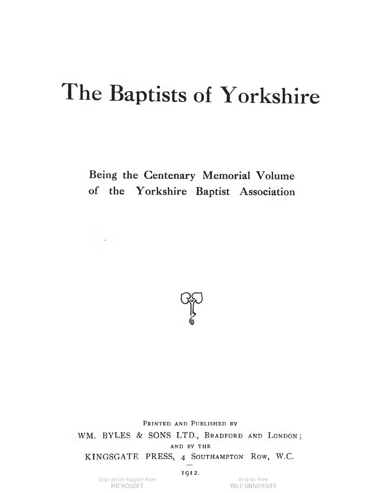 The Baptists of Yorkshire: Centenary Memorial Volume of the Yorkshire Baptist Association (Wm. Byles & Sons Ltd. / Kingsgate Press, 1912) ***