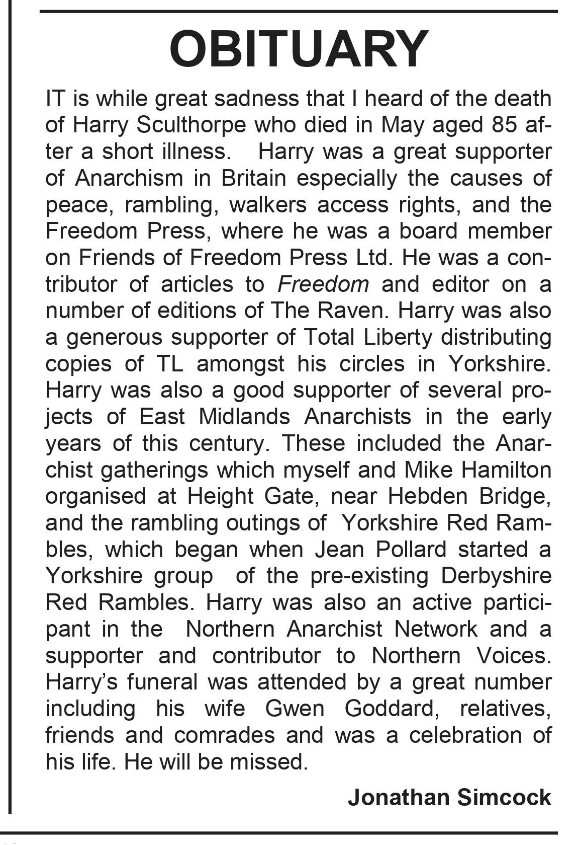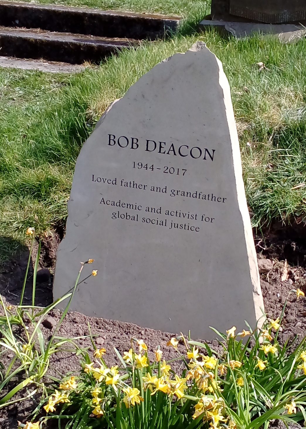 In his later years, while continuing to be part of the global academic community, he became active in local politics and community activism, and was involved with Hebden Bridge Community Association, Hebden Bridge Partnership, Friends of Hebden Bridge Station and Hebden Bridge Walkers Action. Bob Deacon died at Overgate Hospice on 1st October 2017, aged 73. He is buried in plot D1036 at Wainsgate (which he bought himself in March 2017), and his grave is marked by a simple sandstone boulder, with an inscription carved by Jeremy Bancroft. His life was celebrated with a humanist ceremony at Wainsgate which he apparently planned himself.