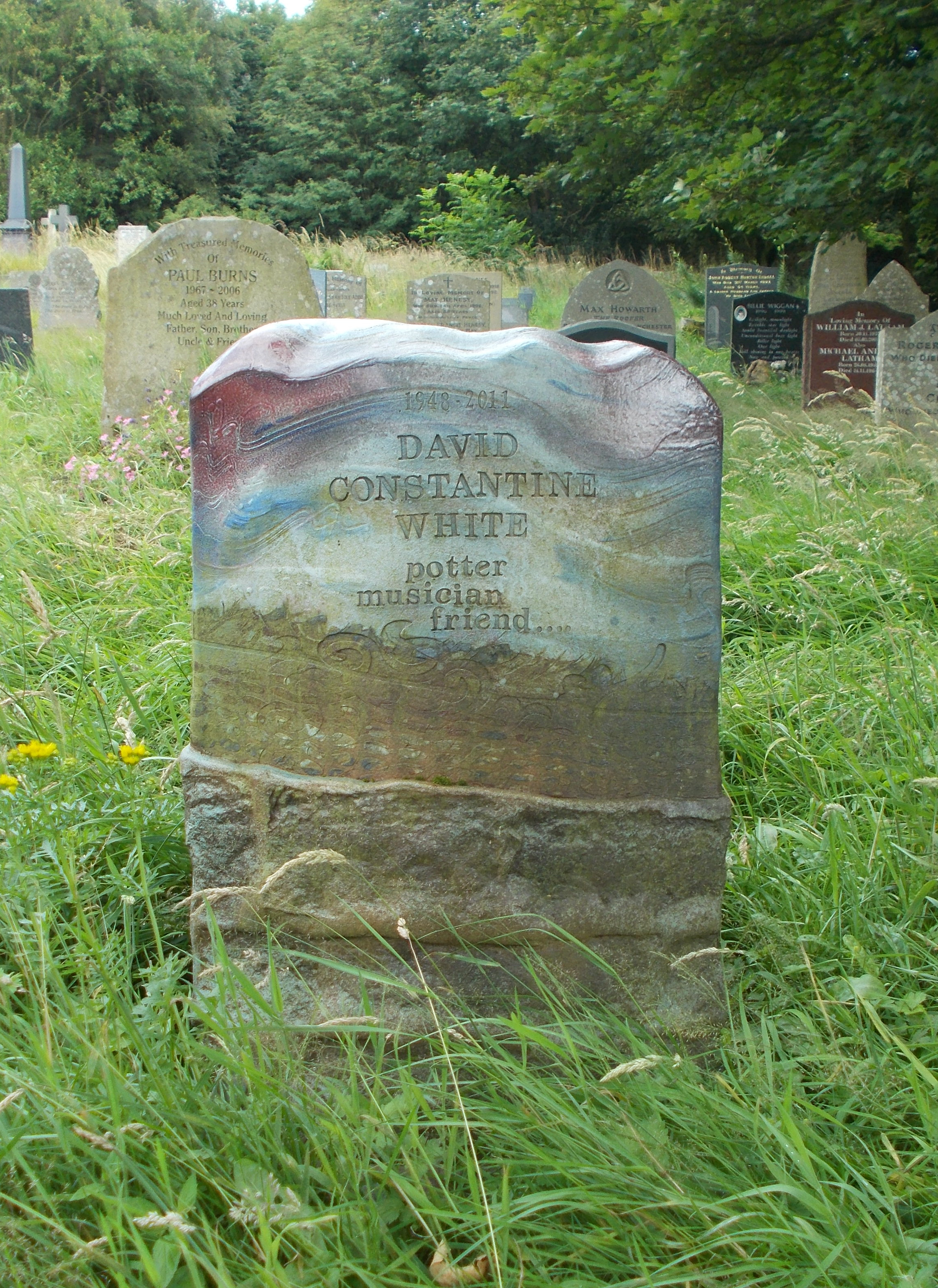 David Constantine White died on the 27th October 2011 at Huddersfield Royal Infirmary, aged 63. His grave at Wainsgate (plot H1028) is marked by a distinctive ceramic headstone made by his friend and fellow potter Jim Robison.