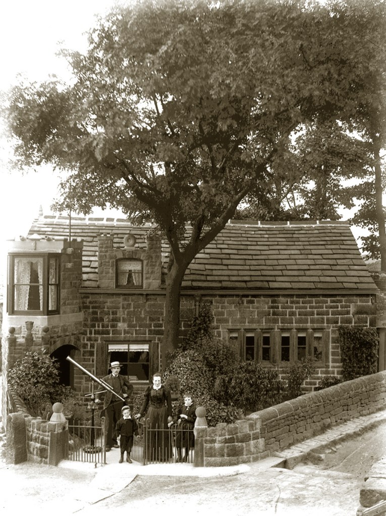 The telescope shown in the photograph (presumably Crossley’s pride and joy) looks like a refractor with an aperture of around 3″, on a pillar mount rather than a tripod, and would have been ideal for a keen amateur astronomer. A telescope like this would not have been cheap, probably costing the equivalent of several thousand pounds today.