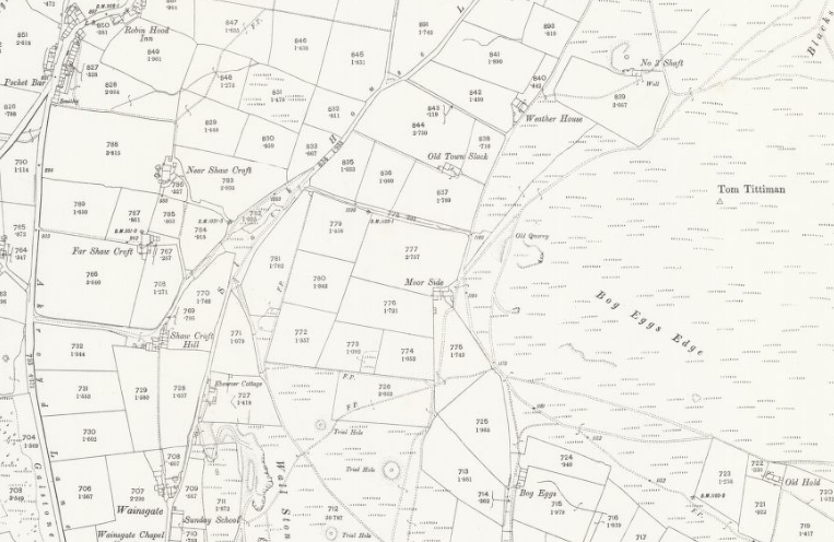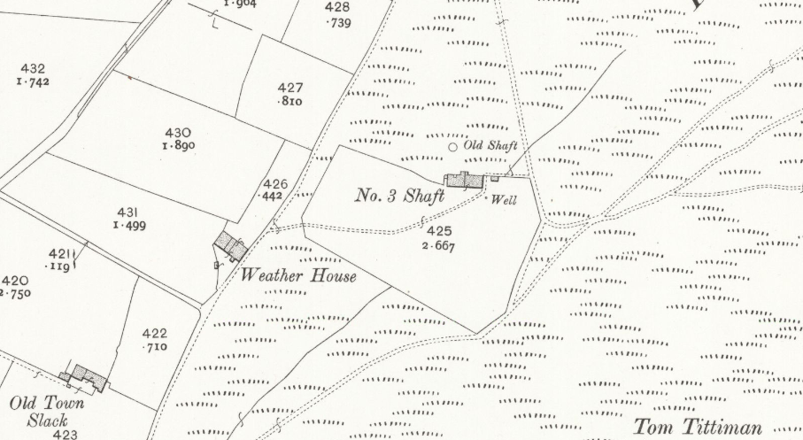 The 1881 census gives the family’s (John, Elizabeth, Albert and his two brothers) address as ‘No. 3‘, and John Parker’s occupation as ‘Stone Delver‘ – probably at nearby Delph End Quarry. Also listed as living at ‘No.3‘ are Abraham Parker, ‘Farmer of 2½ acres’ and his wife Ann – probably John Parker’s parents. The census entry for ‘No.3‘ comes between Weather House and Shawcroft Hill, and it is presumably the ruined building with an attached enclosed field (which is about 2½ acres in area), just above Weather House and next to the ventilation shaft, and marked on old maps as ‘No.3 Shaft‘.