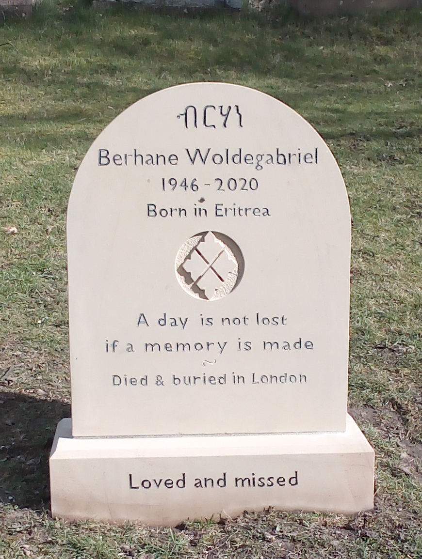 Berhane was spending the COVID lockdown in Todmorden when he received a diagnosis of terminal illness. He expressed the wish to be buried in West Yorkshire and visited Wainsgate in his last months. When his time came, this was not to be, and he was buried in London. Here at Wainsgate, a headstone is erected in his memory, made from local sandstone by Whitakers of Hebden Bridge. The inscription at the top of the stone is in Ge’ez script and