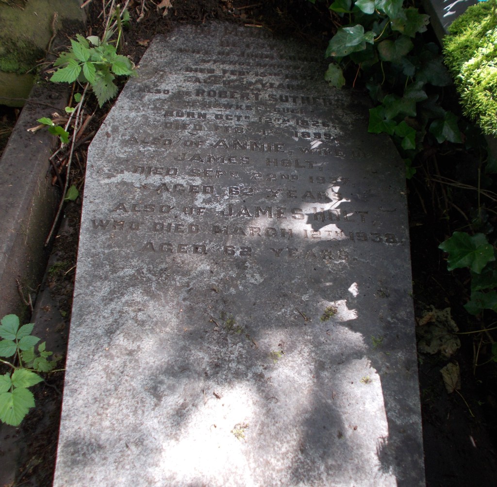 Robert Suthers had bought the plot where he was to be buried (B118a) some time before his death, and in 1897, Betsy Lumb of White Lee, Mytholmroyd, wife of John Lumb, was buried there. There were two more burials in the plot after Robert Suthers – Anne Holt, who died in 1937 aged 62, and her husband James Holt who died in 1938 aged 62, both of 9 Hawksclough, Mytholmroyd.