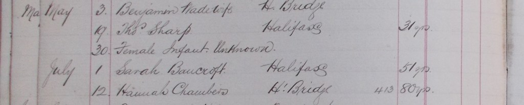 We don’t know exactly where she was buried, and we probably never will – presumably in one of the public or common graves (sometimes known as pauper’s graves) which are known to exist at Wainsgate.