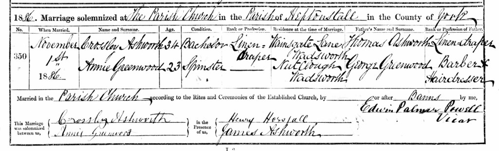 Crossley was 34 years old and living in Wainsgate Lane when he married his first wife, 23 year old Annie Greenwood in 1886. His occupation (as was his father’s) was listed on the marriage certificate as ‘linen draper’. Annie was the daughter of George Greenwood, ‘barber and hairdresser’ of Nutclough. The couple had two children: Alice, born in 1889 and Tom Crossley Ashworth, born in February 1895.