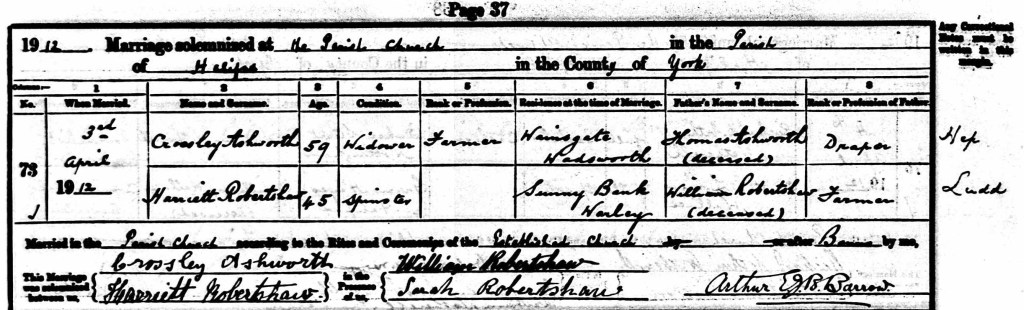 Annie died in November 1895, eight months after the birth of her son Tom, aged 32, and the following April Crossley married his second wife, Mary Pickles, 43 years old and unmarried and living at Gibraltar, Wadsworth. The marriage certificate describes Crossley, aged 43 and living at Wainsgate as a ‘quarryman’. In the 1901 census 48 year old Crossley, now described as a ‘retired farmer‘ is living at Wainsgate with Mary, Alice, Tom and his brothers William and Alfred, both now employed as ‘fustian weavers’.