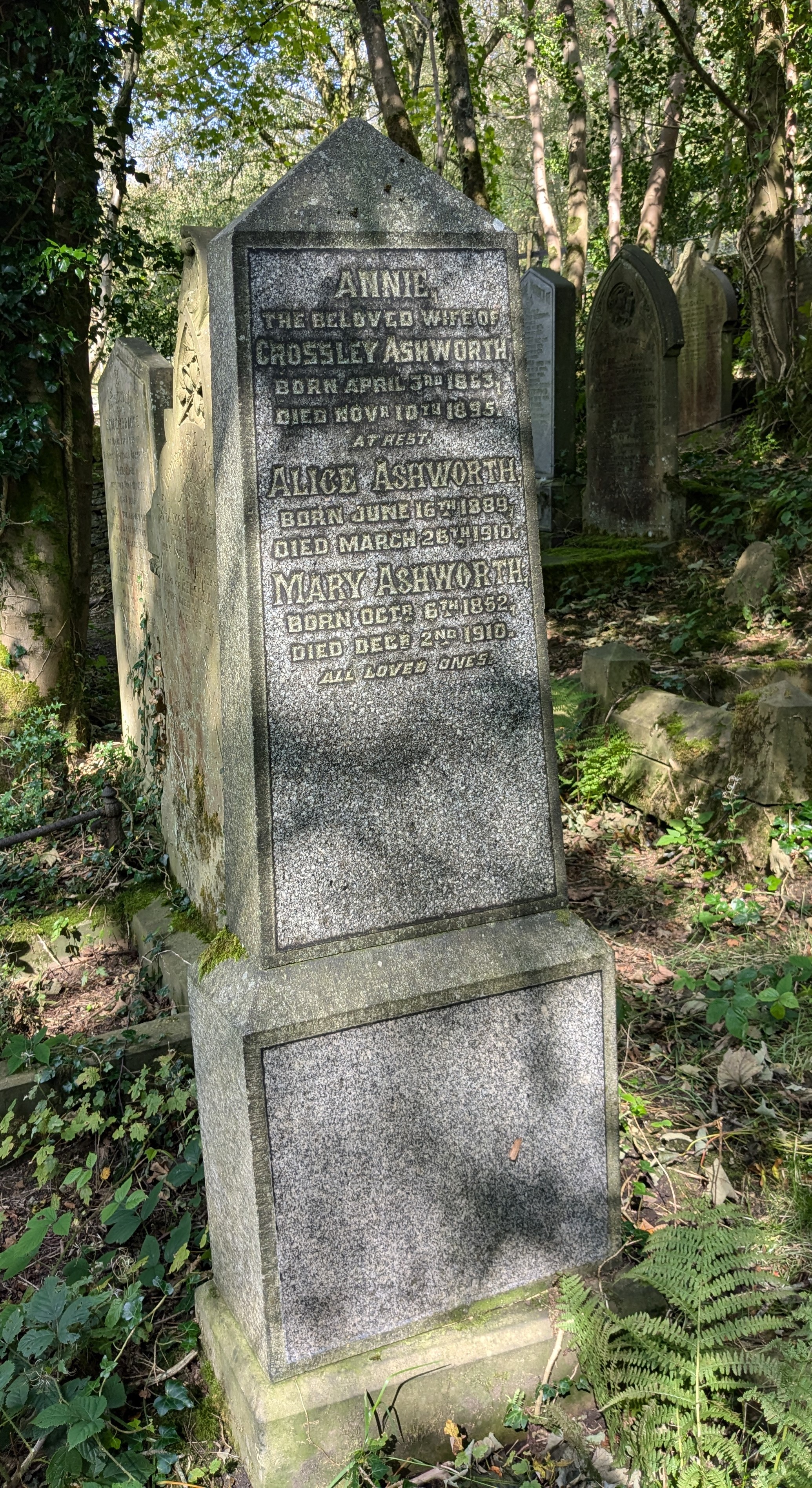 Crossley and his brother William bought two adjacent grave plots on 2nd April 1892 – Crossley bought plot B132a and William bought plot B133a. An unusual memorial stone divides the two plots, with inscriptions on both faces: the side facing B132a commemorates Alfred Ingham Ashworth (1862-1906) and his brother William Ashworth (1855-1918). The other side commemorates Crossley’s first two wives, Annie (1863-1895) and Mary (1852-1910) and his daughter Alice (1889-1910). All five are known to have been buried at Wainsgate.