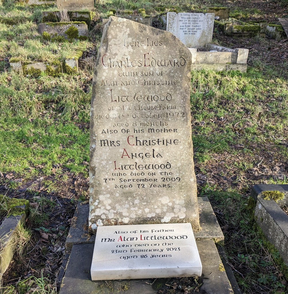 The family bought a plot at Wainsgate (I893) for the burial in 1972 of their son Charles Edward, the fifth child of Alan and his wife Christine Angela (born Hall), a twin who died at the age of 8 months. Christine died in 2009, aged 72, and Alan died in Chapel-en-le-Frith in 2023, aged 86.