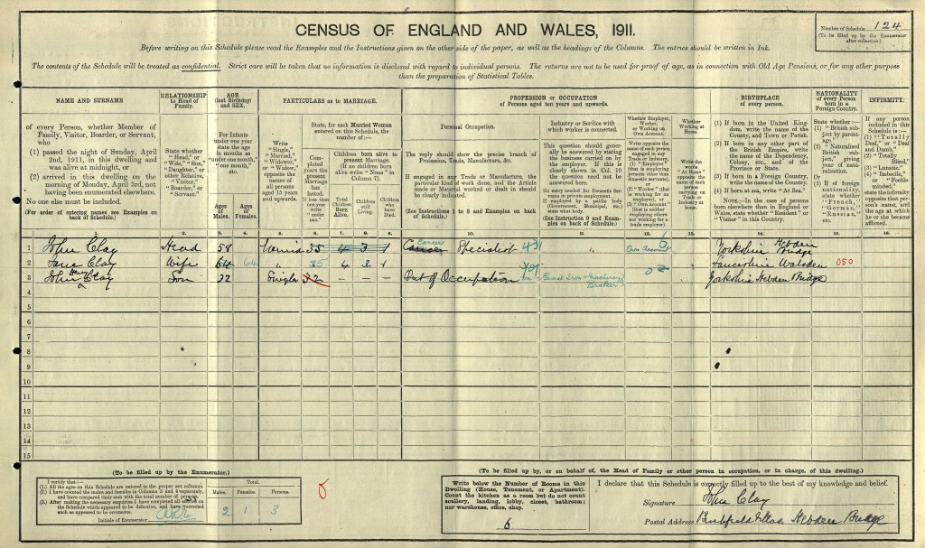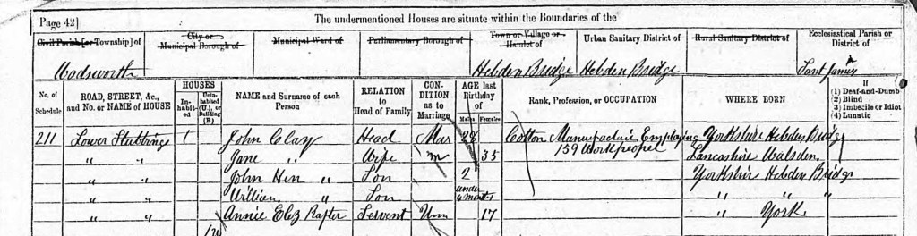 The family lived at Lower Stubbings, Hebden Bridge, and had a 17 year old live-in servant, Annie Elizabeth Rafter. His older brother William Henry Clay lived nearby and was described in the 1881 census as a ‘Cotton yarn agent’.