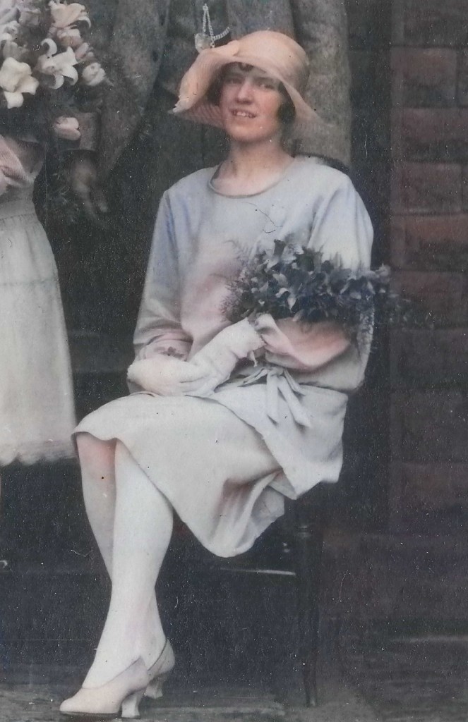 The photograph on the right is captioned ‘Mary Hannah, Gordon Mitchell and Harriet’. Mary Hannah is presumably Mary Hannah Crossley, Gordon’s mother, and Harriet is probably Harriet ‘Hetty‘ Sowden, Mabel’s mother. Perhaps the photograph was taken at Gordon and Mabel’s wedding – is that confetti on his shoulders?
