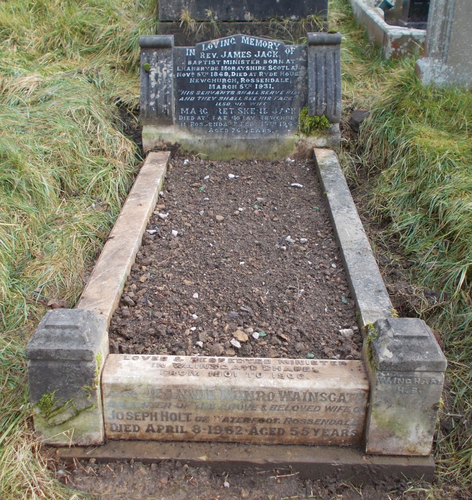Minister at Wainsgate from 1901 to 1906. Named his daughter Jeannie Munro Wainsgate Jack. Buried at Wainsgate with Jeannie and his wife Margaret.