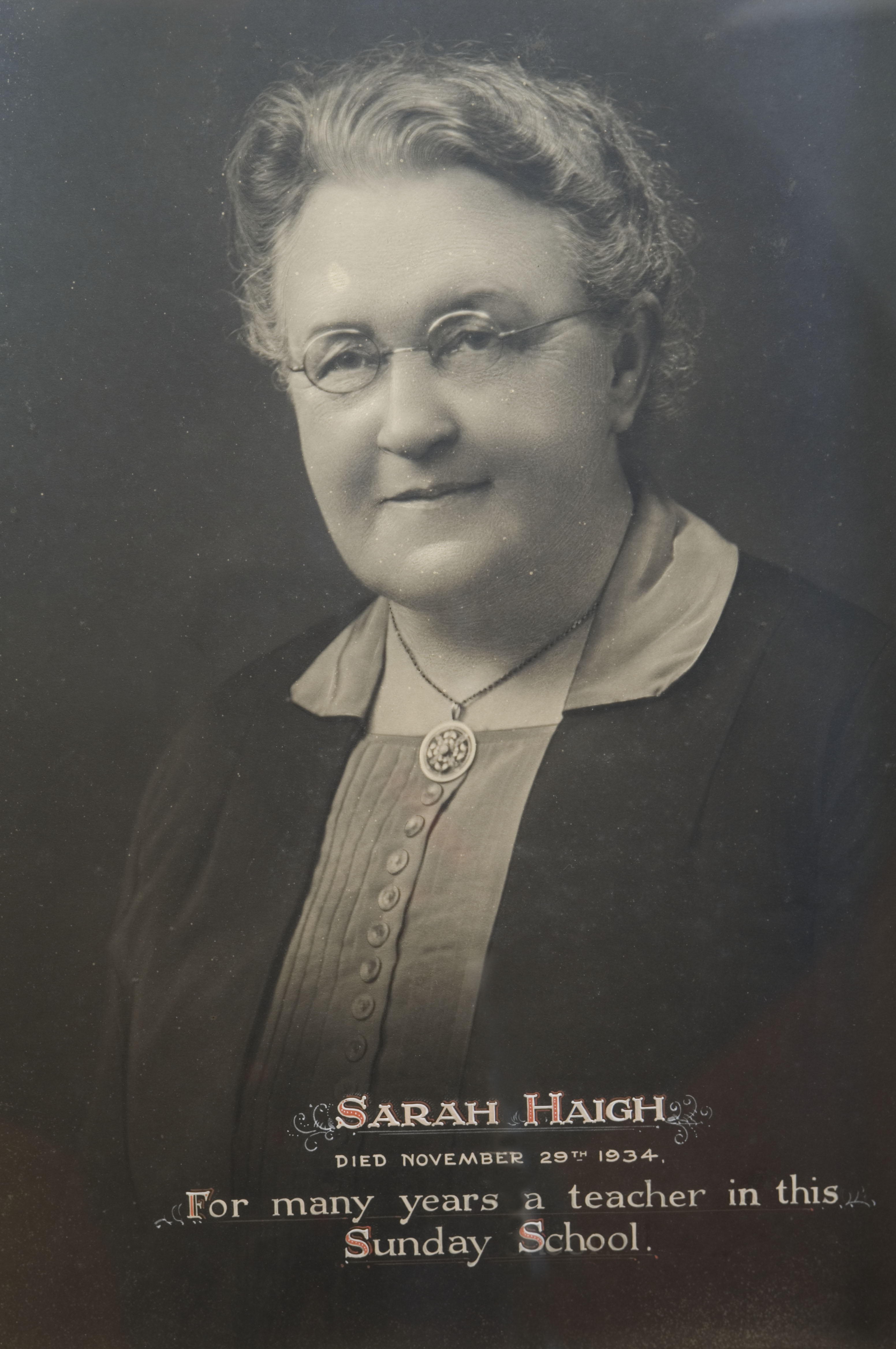 Harry Haigh appears in the photo (although wrongly captioned as H.T. Haigh) and Sarah is almost certainly in the photograph, although like all the other women (presumably all Sunday school teachers) she is not named. She is probably the woman standing behind Thomas and in front of Harry Haigh.