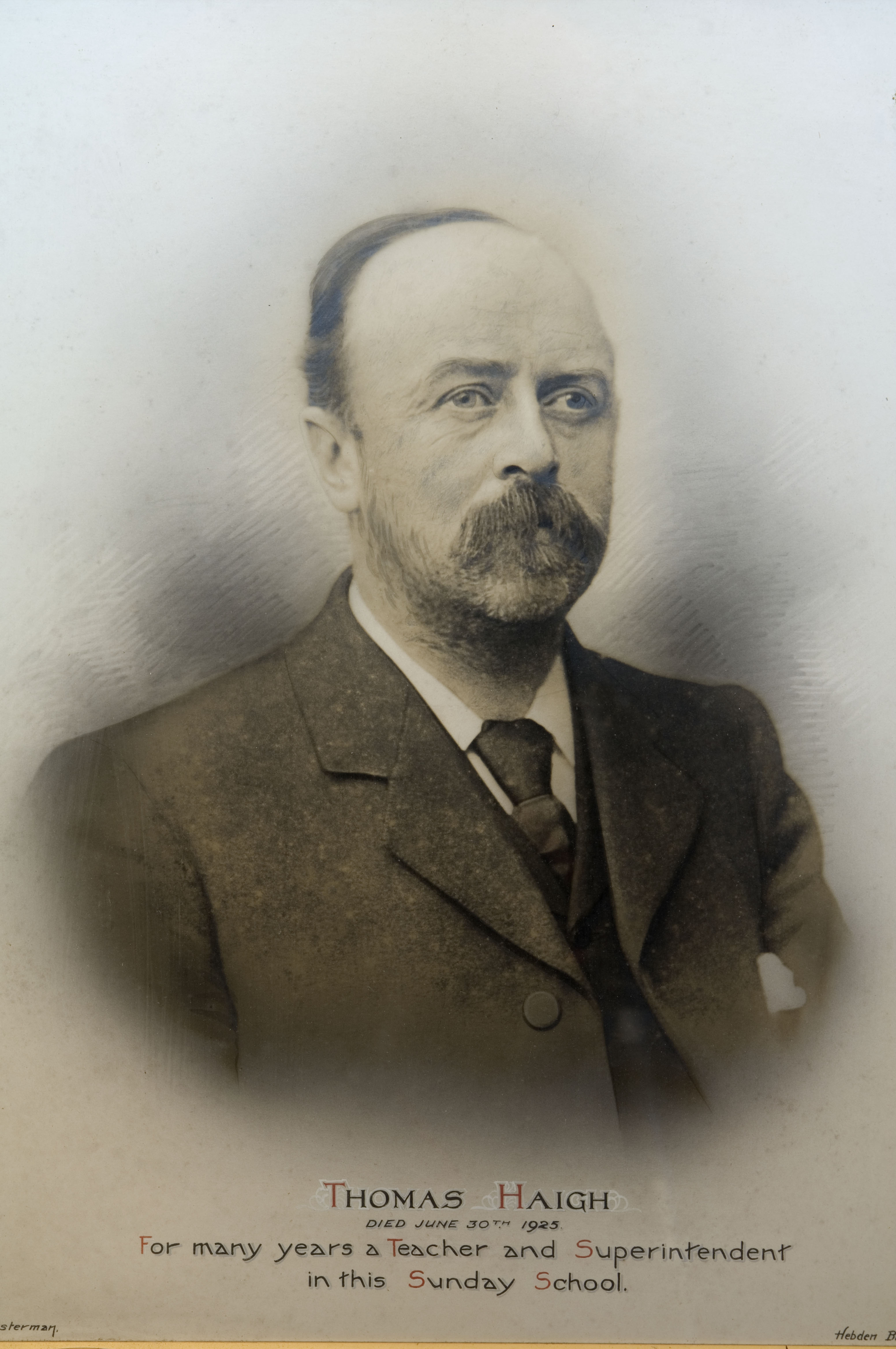 Thomas Haigh (1858-1925) was Church Secretary for 21 years and Sunday School teacher and Superintendent for almost 50 years. His wife Sarah (born Bancroft, 1866-1934) was a Sunday School teacher for many years, and their son Harry (1903-1956) was associated with the Sunday School throughout his life, as scholar, teacher and Superintendent.