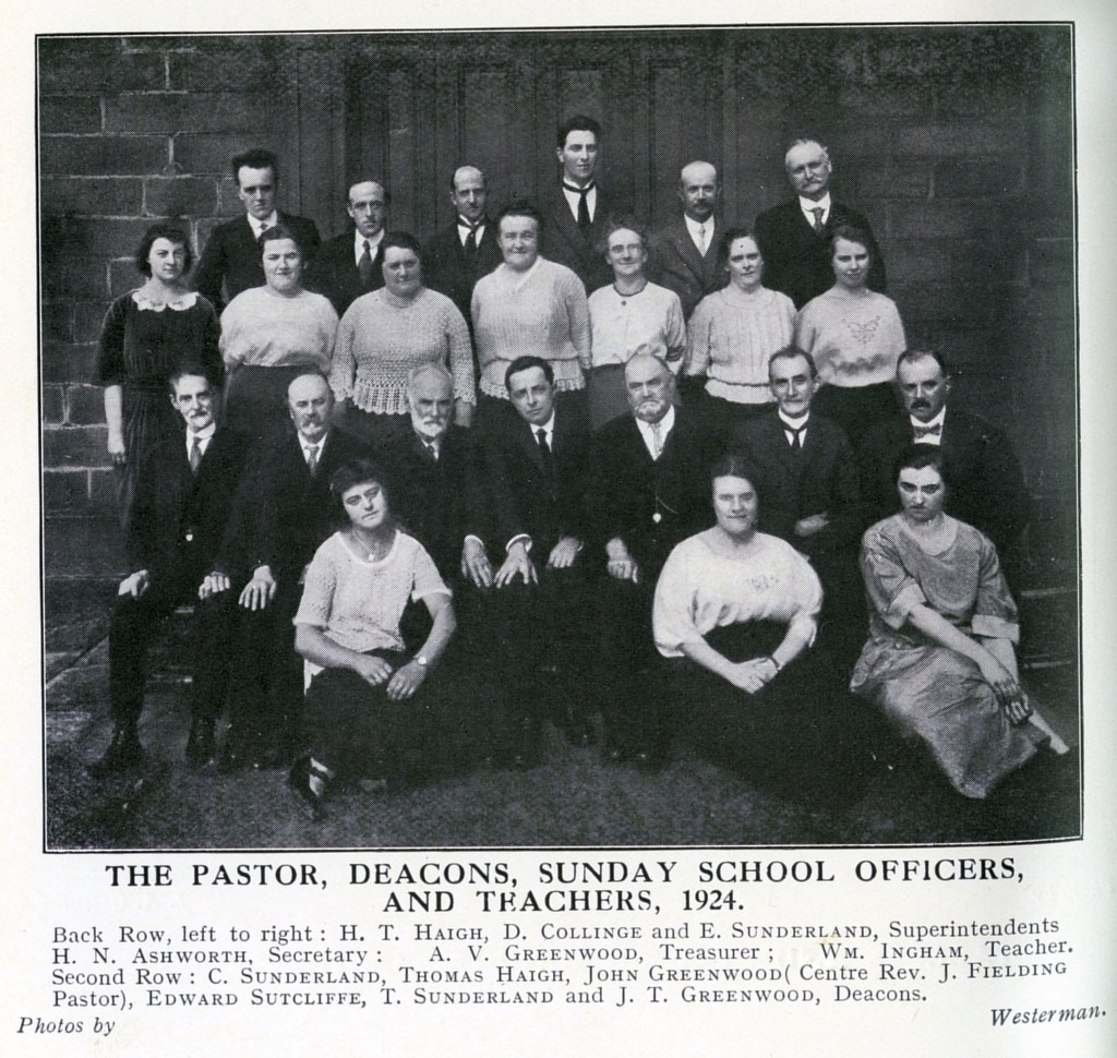 The 1924 photograph of Wainsgate’s pastor, deacons, Sunday school officers and teachers shows six people named as deacons: C. Sunderland, Thomas Haigh, John Greenwood, Edward Sutcliffe, T. Sunderland and J.T. Greenwood.