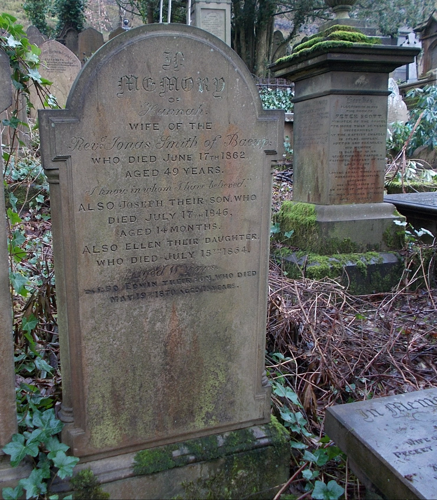 Minister at Wainsgate from 1845 to 1847. His first wife Hannah and three children (Joseph, Ellen and Edwin) are buried at Wainsgate. Jonas Smith’s burial place is unknown.