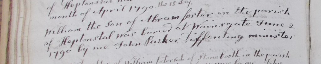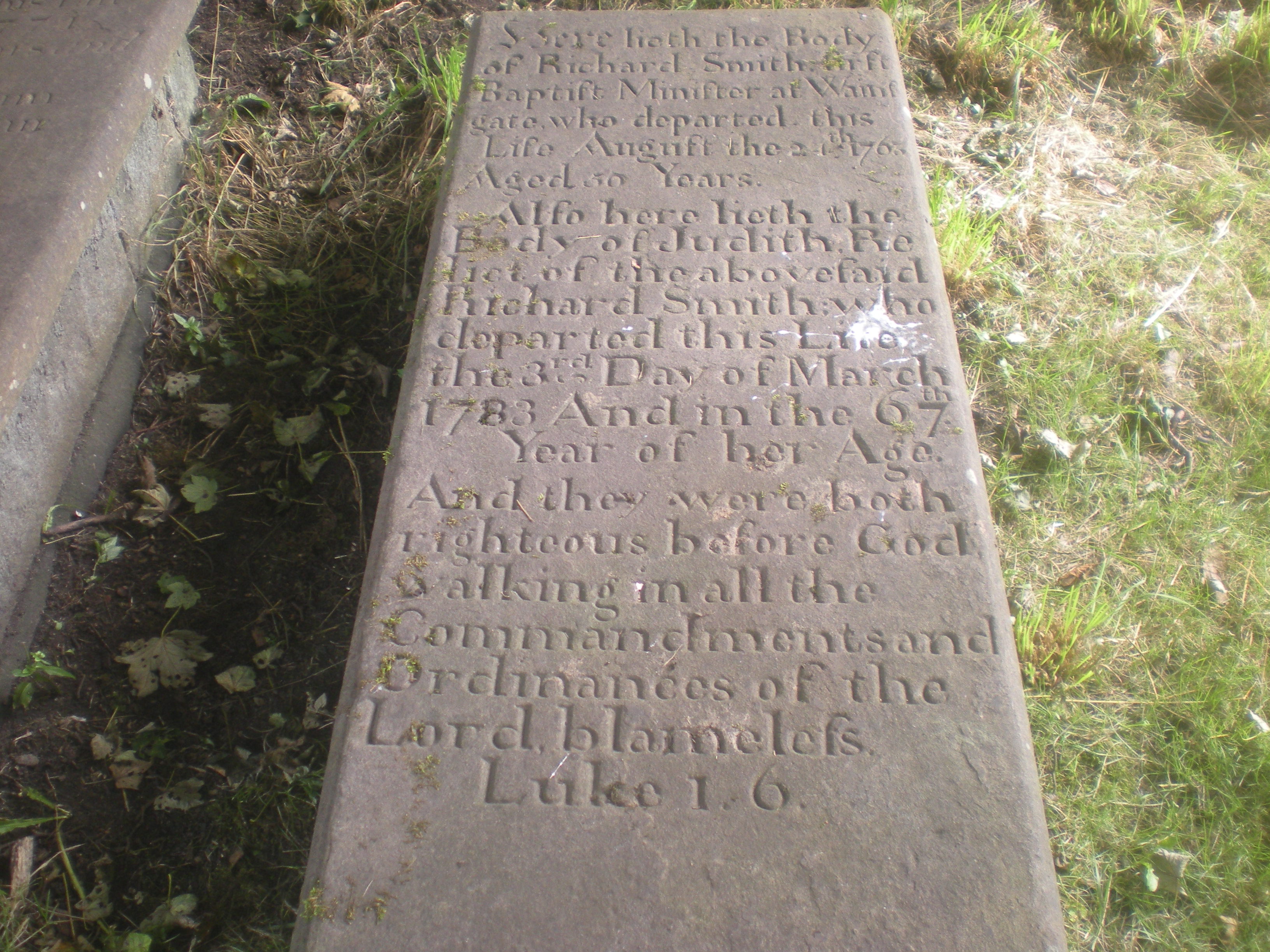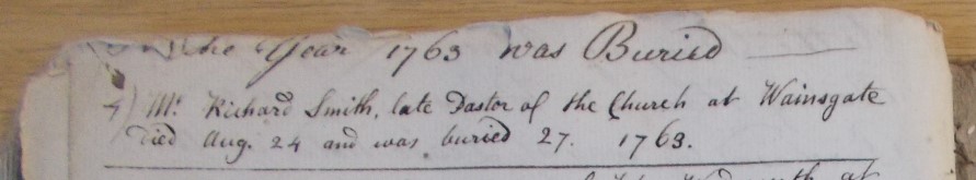 Richard Smith suffered from ill health for much of his life: his final illness was ‘long and tedious, and his pain for the most part very severe’. He died (or as Fawcett put it ‘His soul was dismissed from this tenement of clay’) on 24th August 1763 and was buried on the 27th, seemingly the fourth person to be buried at Wainsgate.