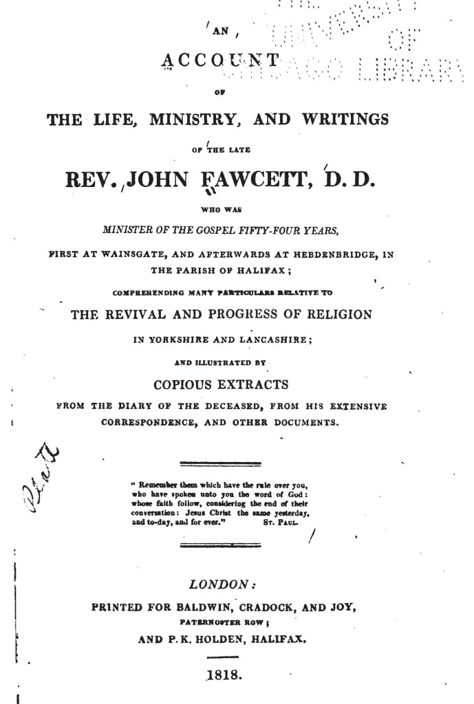 (Quotations from An Account of the Life, Ministry and Writings of the late Rev. John Fawcett D.D, by his son John Fawcett jnr, 1818).