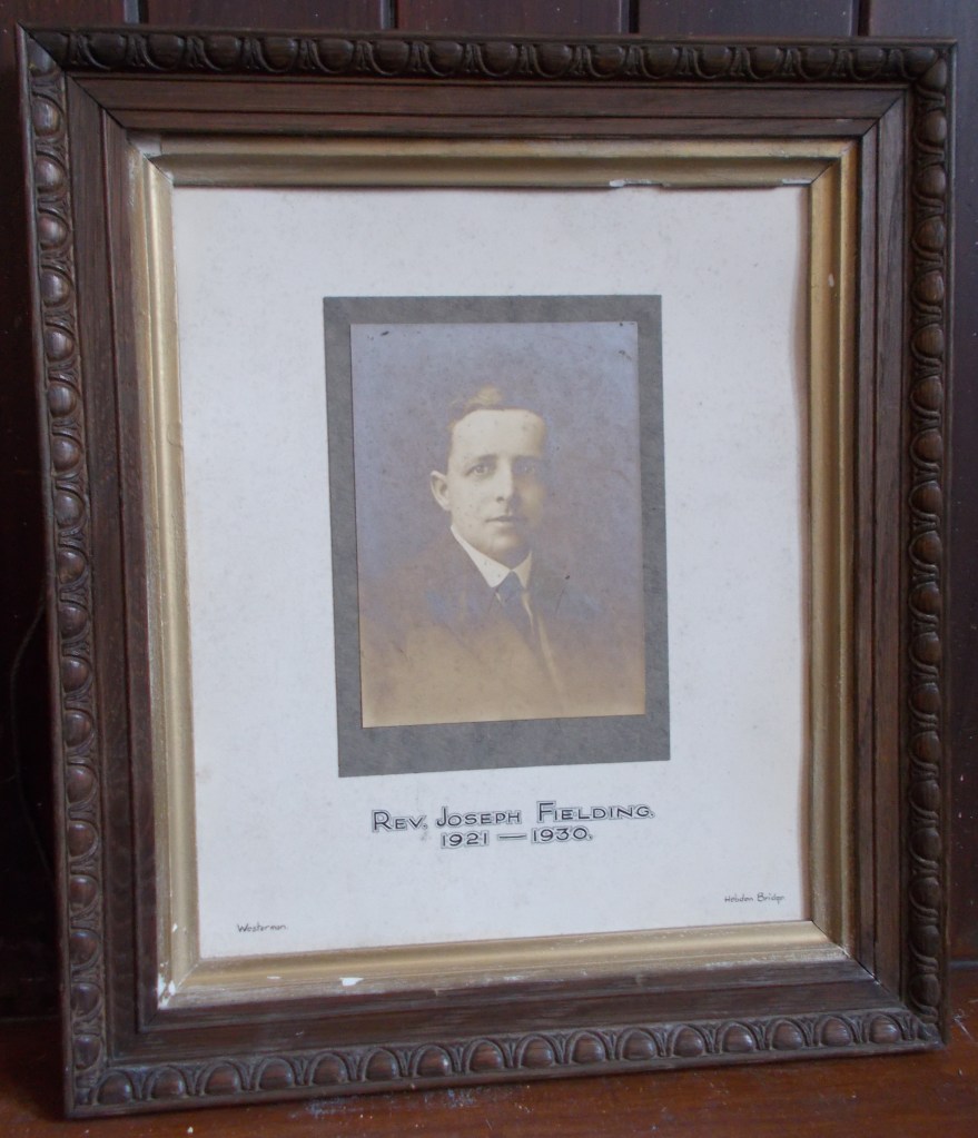 Eddison Sunderland was a Sunday school teacher, and died in 1925 aged 32. He appears on the 1924 photograph (captioned as a Superintendent of the Sunday school) and is also commemorated with a brass plaque in the chapel and a framed photograph displayed at Wainsgate.