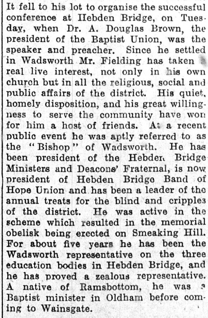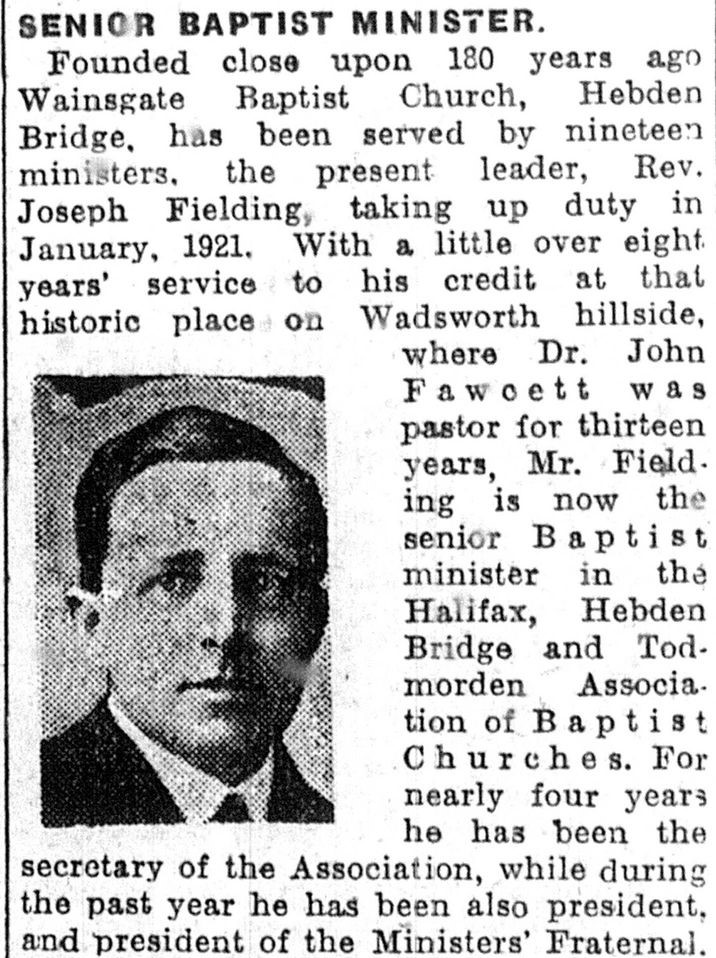 Minister at Wainsgate from 1921 to 1930, coming there from Oldham. Once referred to as ‘the Bishop of Wadsworth’.