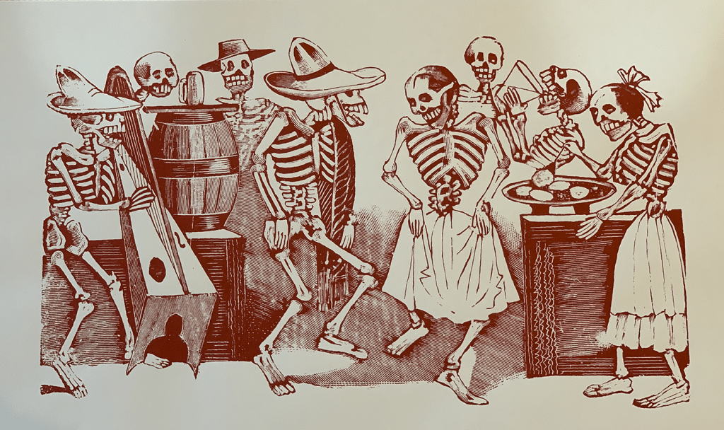José Guadalupe Posada Aguilar (1852–1913) was a Mexican lithographer, engraver and cartoonist, best known for his calavera images (calavera literally translates as skull, but has come to mean the entire skeleton). Posada is generally credited with popularizing the calavera images associated with the Day of the Dead in Mexico, and his most iconic image is a calavera image wearing a hat decorated with flowers. She appeared originally as ‘la Garbancera’ and was later named ‘la Calavera Catrina‘ by Diego Rivera. ‘La Catrina’ as she is now known, is believed to have first appeared in 1912, just a few months before Posada’s death.