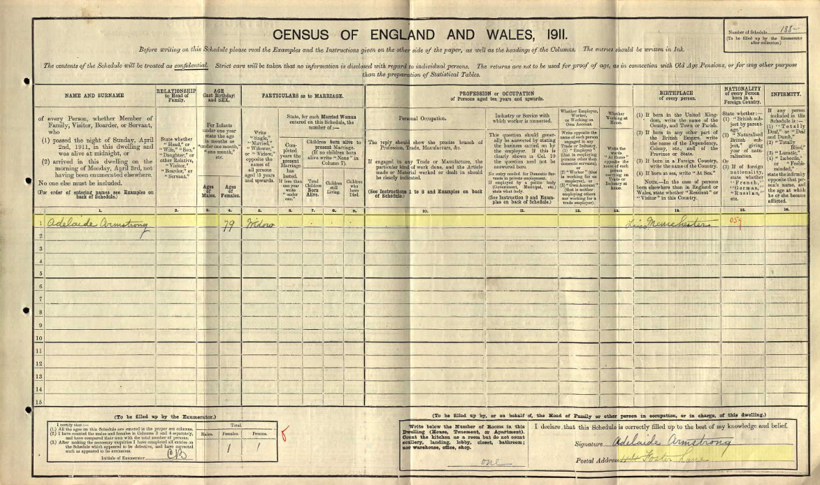 Adelaide, the only one of the sisters still living at the time of the 1911 census (taken on 2nd April), was living at 44 Foster Lane, Hebden Bridge. The census form (filled in by the occupier) records Adelaide as the only occupant of the dwelling, but the Schedule (which was filled in by the Enumerator), records the ‘Name of Head of Family or Separate Occupier’ as Elizabeth Healey, the name being crossed out and replaced with Adelaide Armstrong. But Elizabeth had died in Todmorden Workhouse in September 1910, so this is hard to explain – the census forms were only distributed a few days before 2nd April 1911.