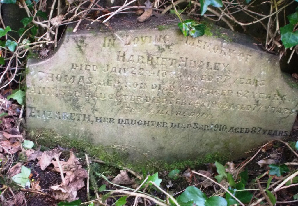 Elizabeth Healey is buried in Plot B121a, with her mother Harriet Healey, brother Thomas and sister Ann Healey (although Ann’s burial is not recorded in the burial register). Another sister, Adelaide, is also buried at Wainsgate in Plot B200a, with her husband John Armstrong.
