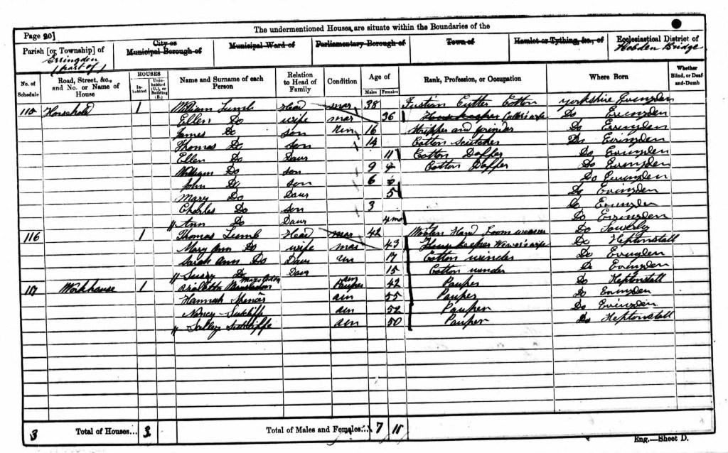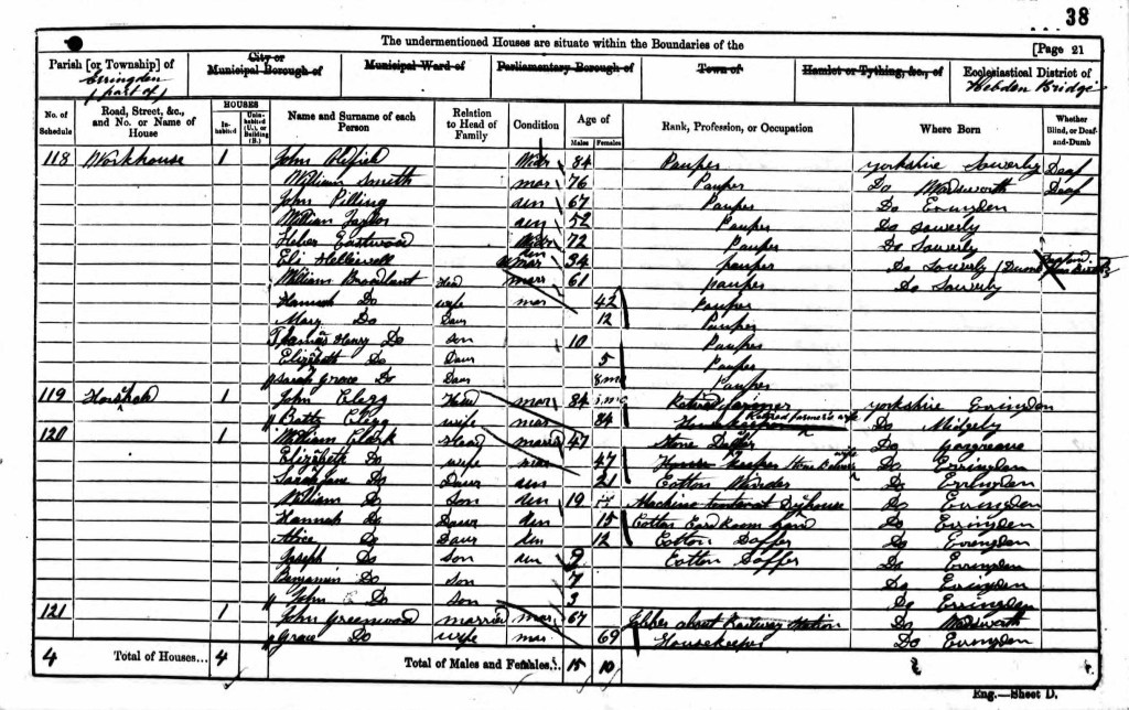 In 1891 she was living alone at 65 Towngate, Midgley (a three roomed dwelling), aged 62 and still working as worsted weaver. We don’t know when or why she went into the Workhouse, but there is no record of any surviving children who could have supported her when she presumably became unable to work, and she does not appear to have remarried after the death of her husband.